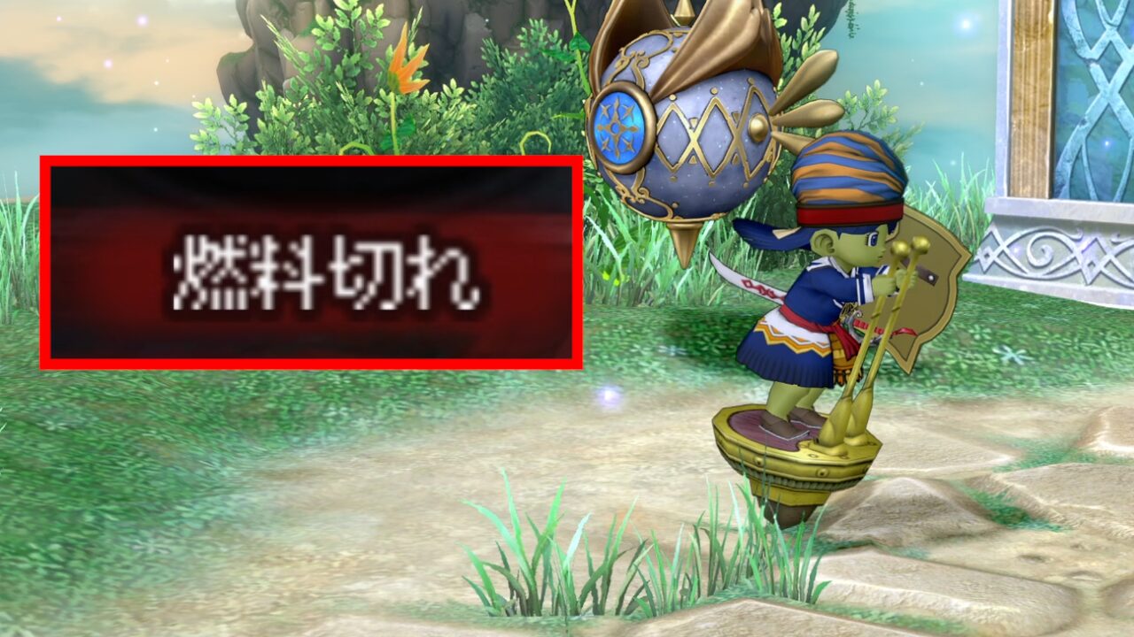 バージョン6.1までは燃料がなくなると自動的にドルボードから降りる仕様だったようですが、今は「燃料切れ」という表示がでるだけでドルボードに乗り続ける事ができます。「聖天のつばさ」エリアで強制的に降ろされると場所によっては復旧困難になる場合があるためというのが理由のようです。