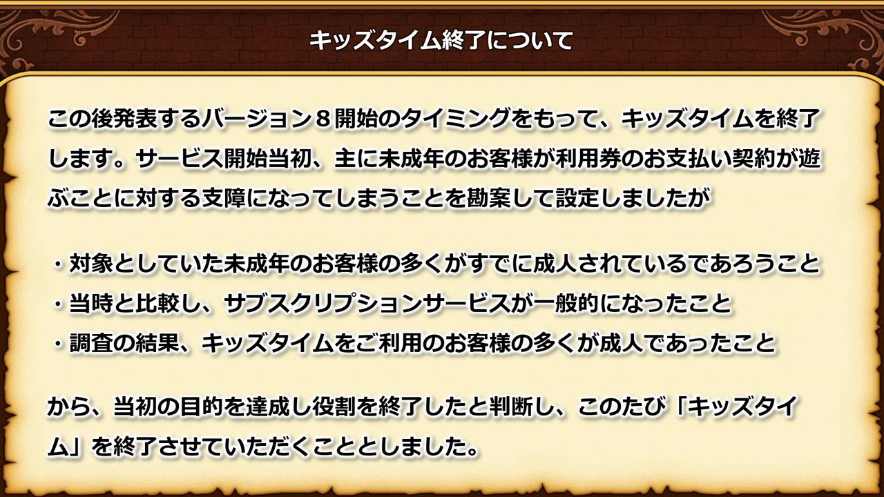 2025年12月25日のDQXTVで発表された「キッズタイムの廃止」。 正直な感想を言えば「ついに来たか」というのが第一印象です。