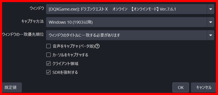 • PC版ドラクエ10: 「ゲームキャプチャ」ではなく「ウィンドウキャプチャ」を使う。